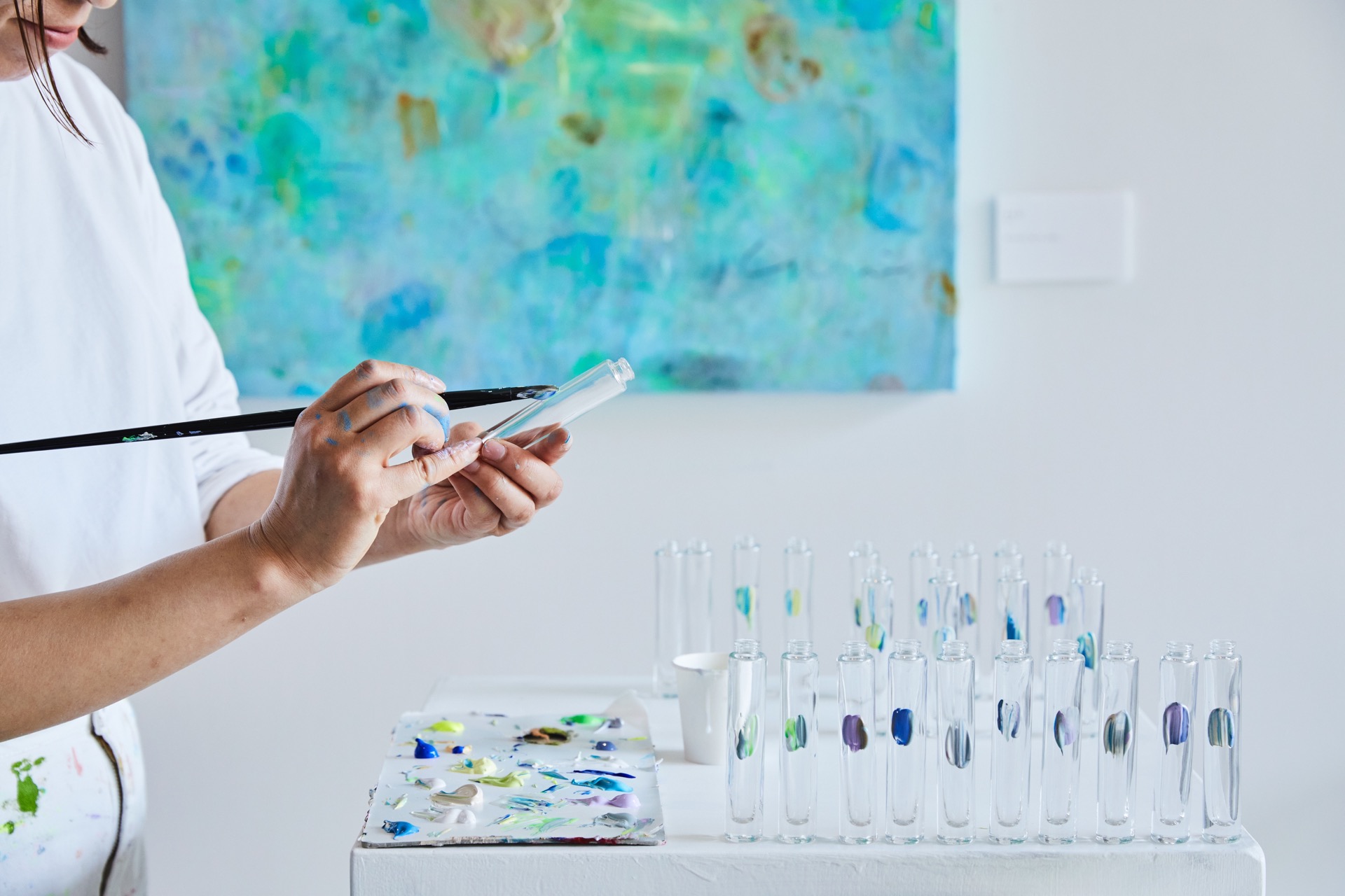 絵美氏の作品「RAW」で使用した絵の具を、そのままボトルへ直接ペイント。100本すべてが異なる表情を持つ、世界に一つだけの一点ものとして仕上げました。