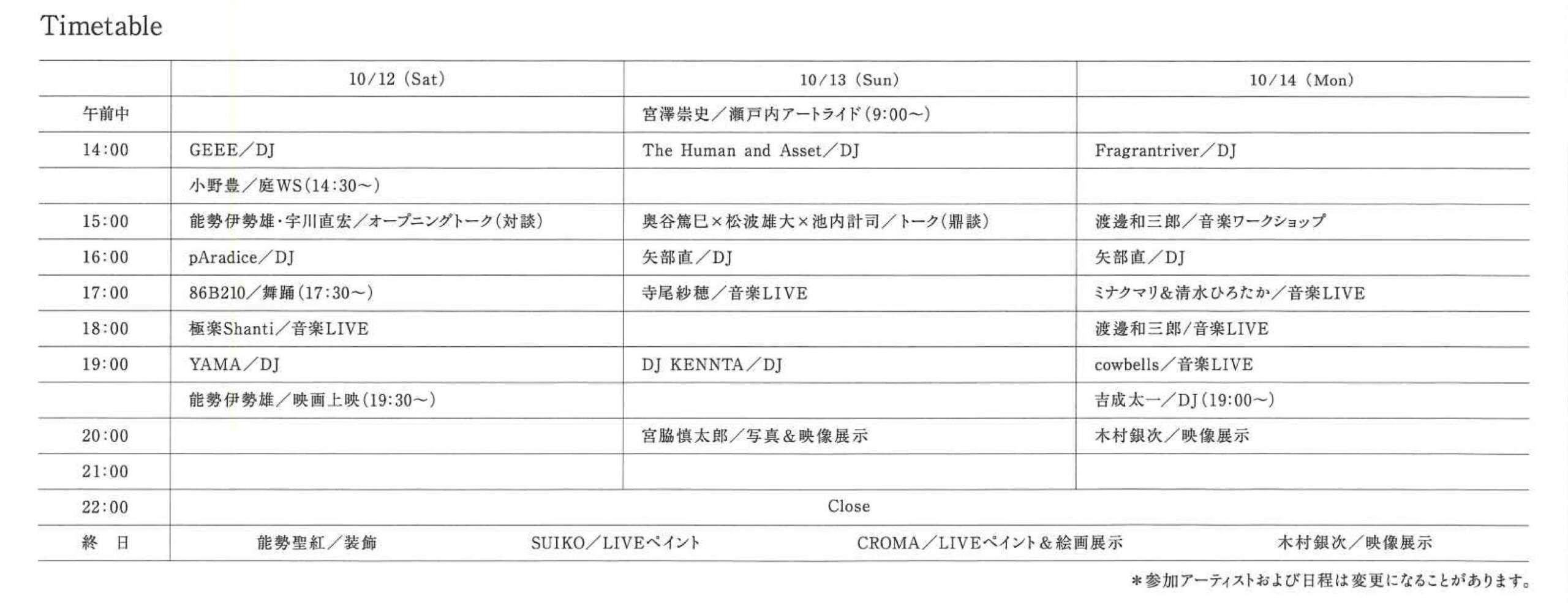 能勢伊勢雄、宇川直宏、寺尾紗穂、伊賀航、矢部直、suiko、能勢聖紅、渡邊和三郎、宮脇慎太郎、86B210、宮澤崇史、YAMA、ミナクマリ、清水ひろたか、小野 豊、 pAradice、GEEE、DJ KENNTA、The Human & Assets、Ginji Kimura、Fragrantriver、極楽shanti
